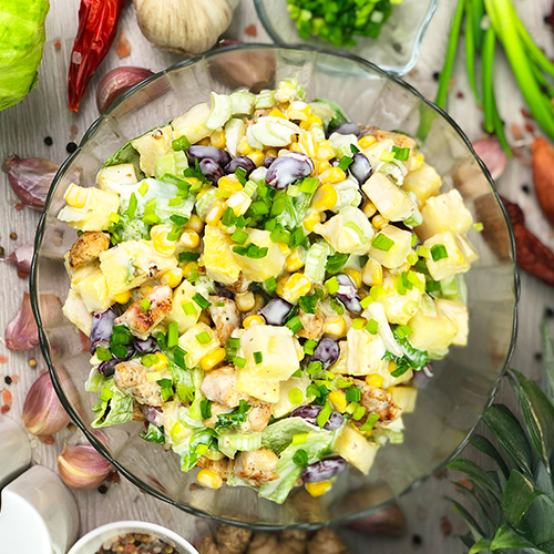 Połączenie soczystego kurczaka i słodkiego ananasa tworzy wyjątkową sałatkę idealną na imprezę lub lekką kolację.